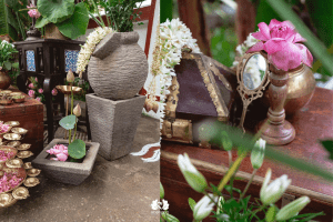 The Rococo revival – delicate pastels, ornate textures – finds harmony with Kerala’s rustic charm. Imagine soft pink drapery against palm-fringed landscapes or traditional brass urulis filled with floating roses.